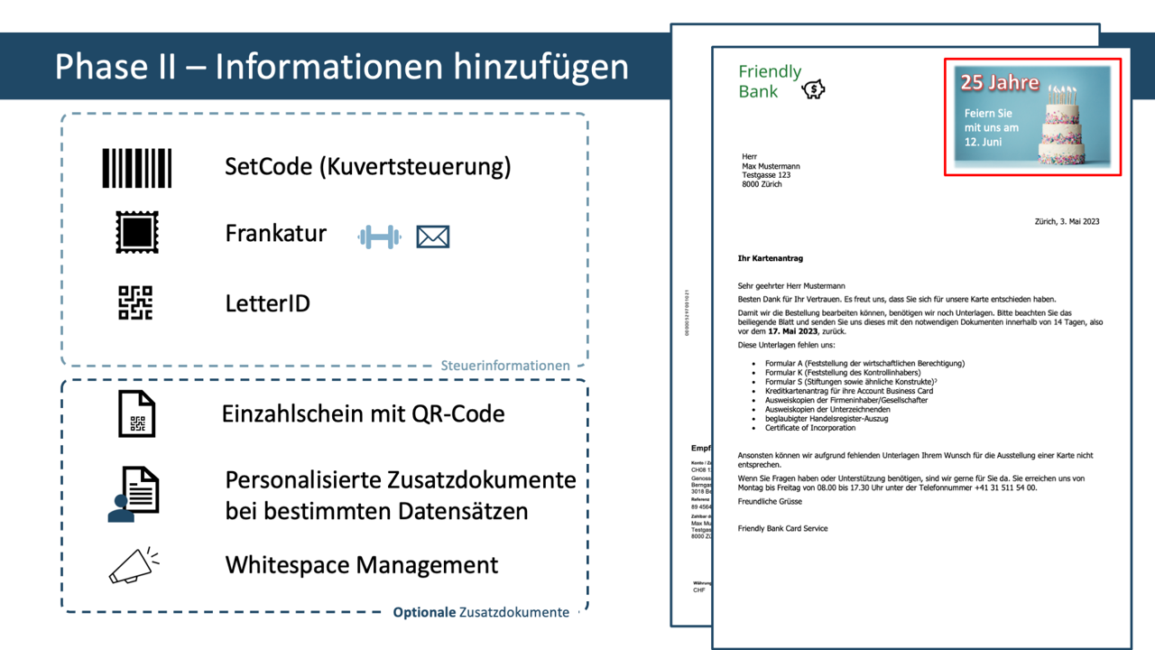 • Vollautomatischer Druck der Dokumente, Zusammenstellung der Dokumente pro Empfänger in der richtigen Sprache, Couvertierung mit Beilagen, Frankierung und Postaufgabe durch Partnerunternehmen
