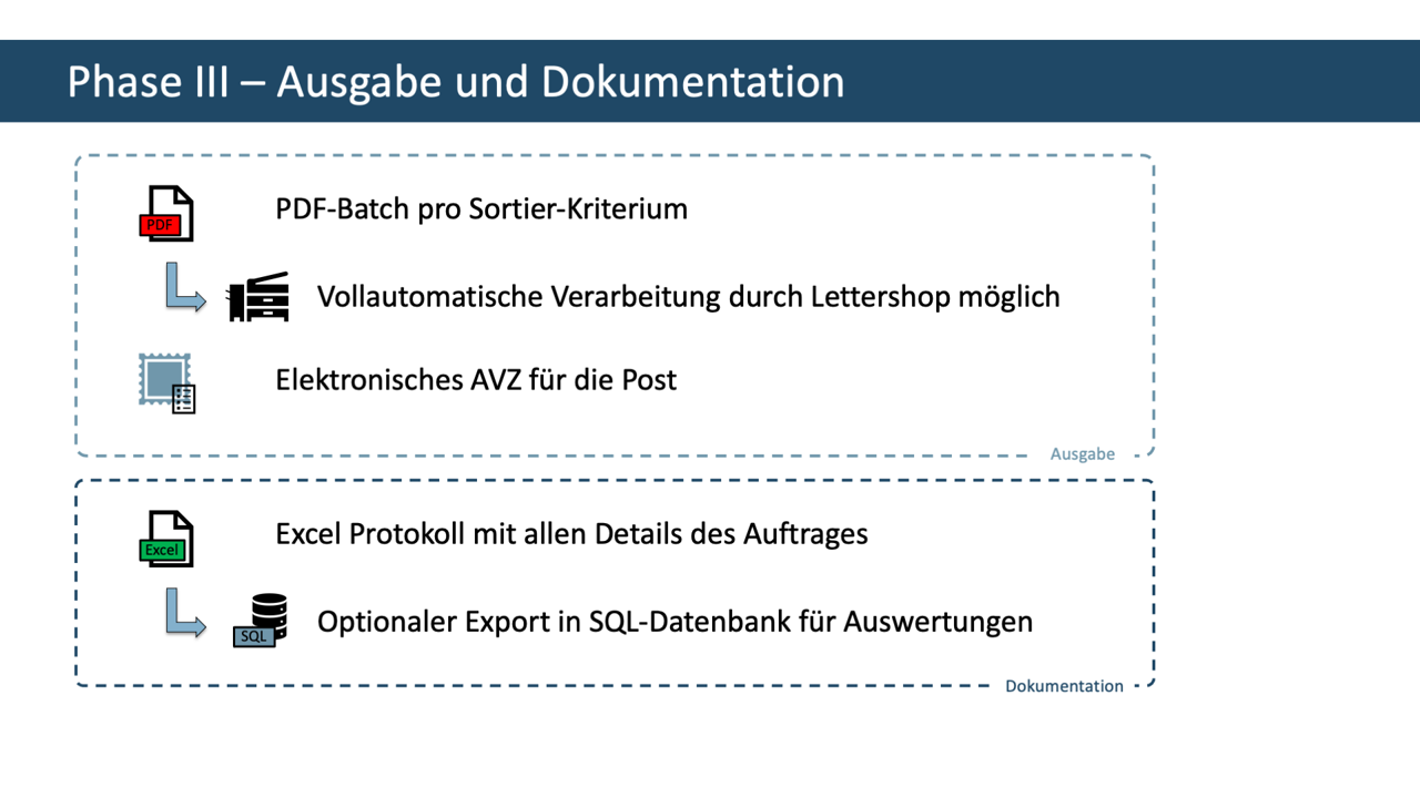 • Pro Sortier-Kriterium erhalten Sie ein vollständiges PDF-Batch. Dieses kann von Drittanbietern vollautomatisiert weiterverarbeitet werden. Ebenfalls erhalten Sie ein elektronisches AVZ für die Aufgabe bei der Post.