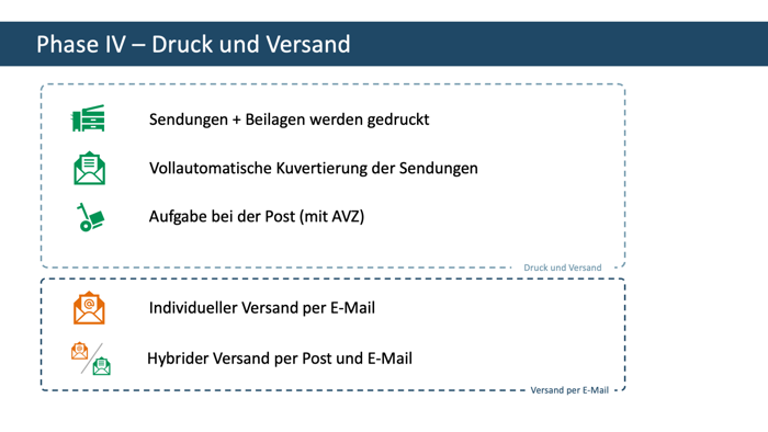 • Sofern Sie sich für den Druck und Versand durch unser Partner Unternehmen entscheiden, kümmert sich dieser vollständig um Druck, Kuvertierung und Postaufgabe Ihrer Sendungen.
