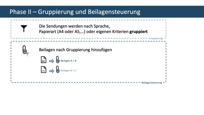 Die Sendungen können nach beliebigen Kriterien (Sprache, Papier, etc.) gruppiert werden. Jeder Gruppierung können eigene Beilagen hinzugefügt werden.