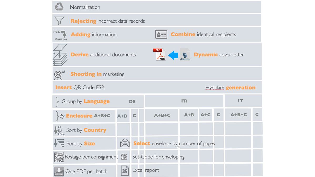 Before closing of daily business, all collected customer documents are processed and sorted by Lettershop Connect. The letters are enriched with additional data as required and optimally prepared for being processed by a highly automated printing specialist (lettershop). The graphic below illustrates an excerpt of the diverse processing options: