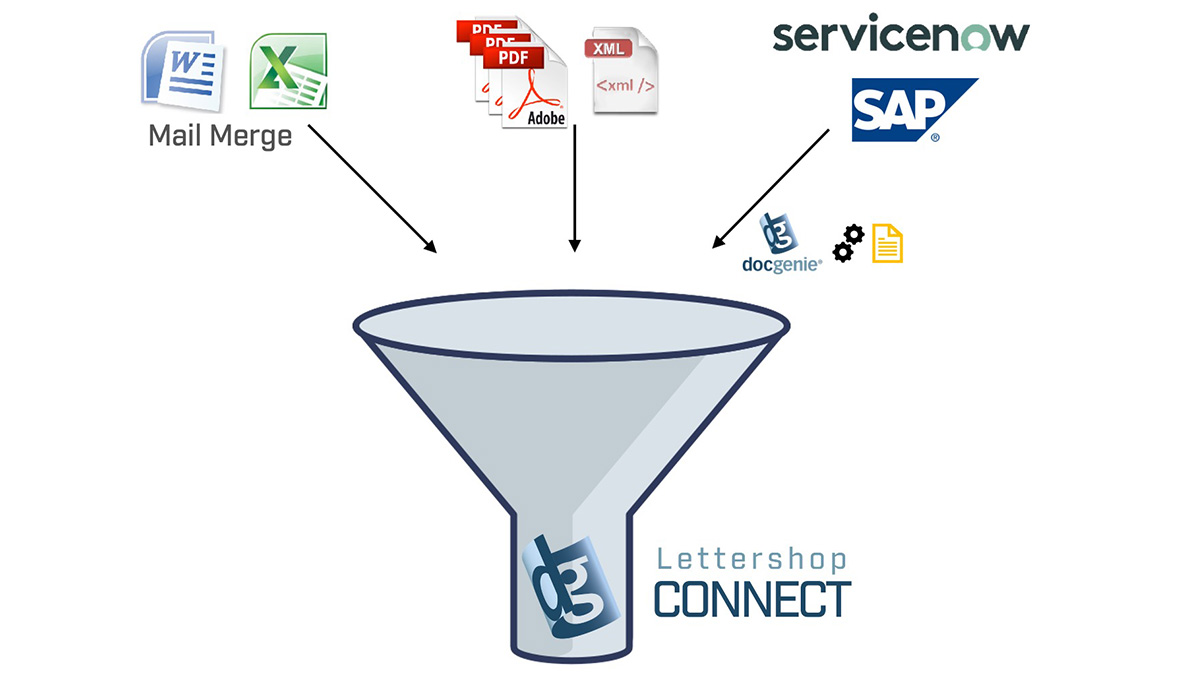 All outgoing letters are collected first. Imagine a sorting machine that has a funnel structure at the top into which you can feed any type of data and documents. These could be Word, Excel, PDF or XML files coming from other IT platforms. Preconfigured interfaces to ERP systems such as ServiceNow or SAP are already built in.