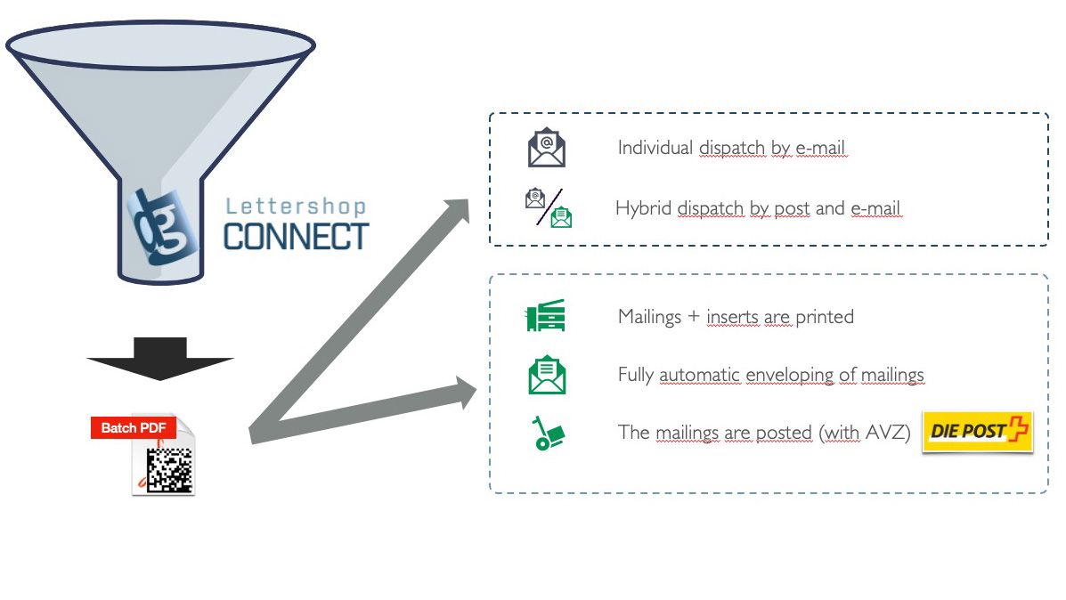 Lettershop Connect acts as a central processing hub for all of a company's outgoing mail. Different mailings for the same customer are combined in a cost and environmentally efficient manner. Of course, hybrid dispatch by e-mail and/or paper mail to your customers is also supported.
