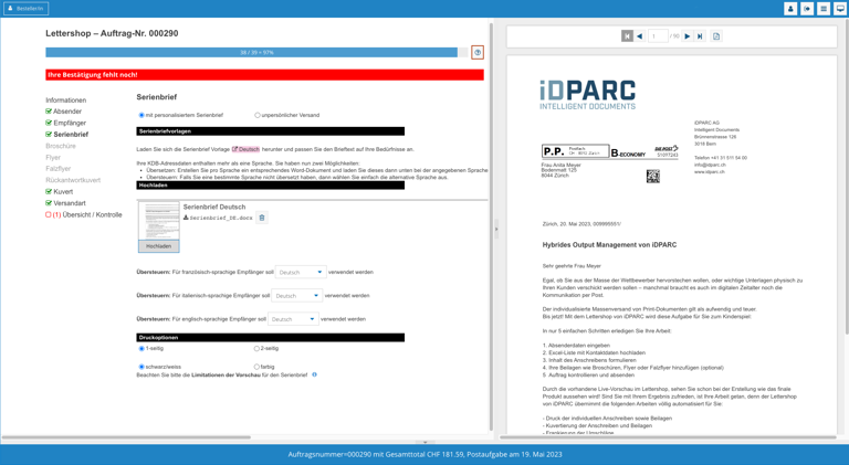 Lettershop Connect von iDPARC ist die All-Inclusive Lösung für Ihr Output-Management. Mit Lettershop Connect generieren, drucken und versenden Sie Ihre Kundenkorrespondenz auf Knopfdruck. Egal ob Print oder E-Mail, egal welches Volumen, jegliche Korrespondenz wird noch am gleichen Tag versendet, garantiert ohne Fehler.