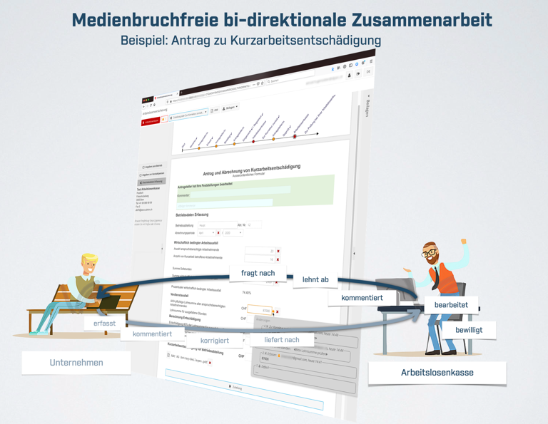 In enger Zusammenarbeit mit dem SECO wurde innert kürzester Zeit den Arbeitslosenkassen ein neuer Online Formularprozess für die effiziente Abwicklung der Anträge für Kurzarbeitsentschädigung zur Verfügung gestellt.