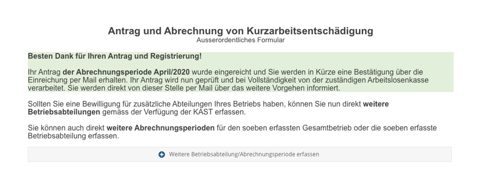 Wenn sich ein Antragsteller registriert hat, so wird ihm der Antrag im Folgemonat erleichtert, da seine Unternehmensdaten bereits bekannt sind. Er kann so beliebige Abteilungen und/oder Abrechnungsperiden sehr effizient einreichen.