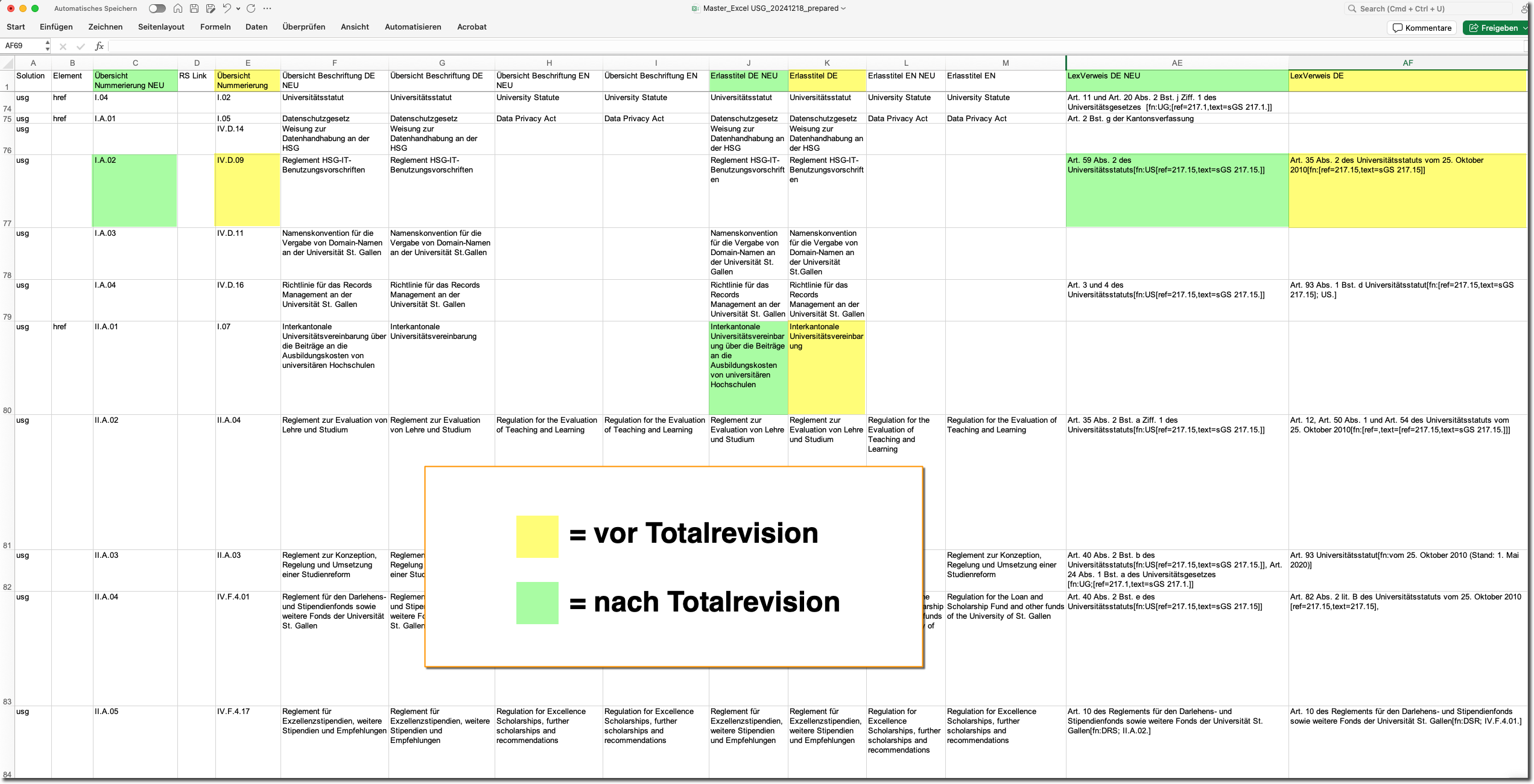 Die Aufgabe für die Universität St. Gallen bestand darin, zuerst ein Inventar-Excel zu exportieren. Darin werden alle bestehenden Erlasse in Tabellenform aufgelistet.